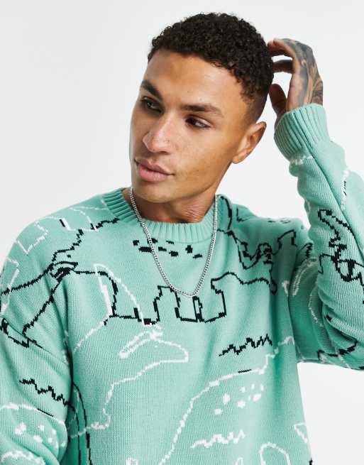 Asos Design Oversized Knitted Jumper With Dinosaur Print In Green Asos